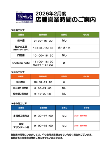 いつも松かまをご愛顧いただきましてありがとうございます。 2026年2月度の店舗営業時間についてお知らせいたします。